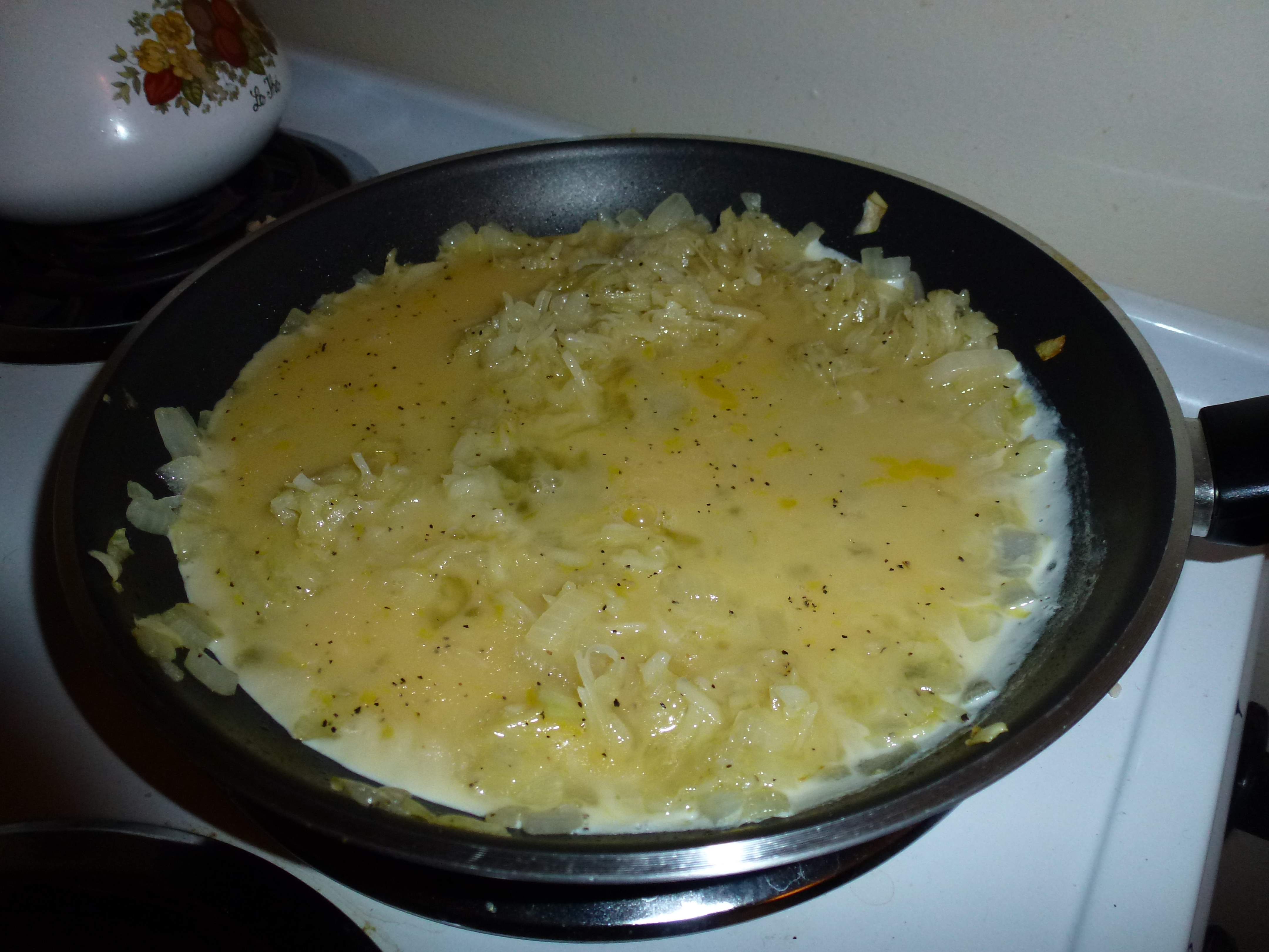 - While onions and potatoes are cooking, whisk together eggs, egg whites, and pepper
