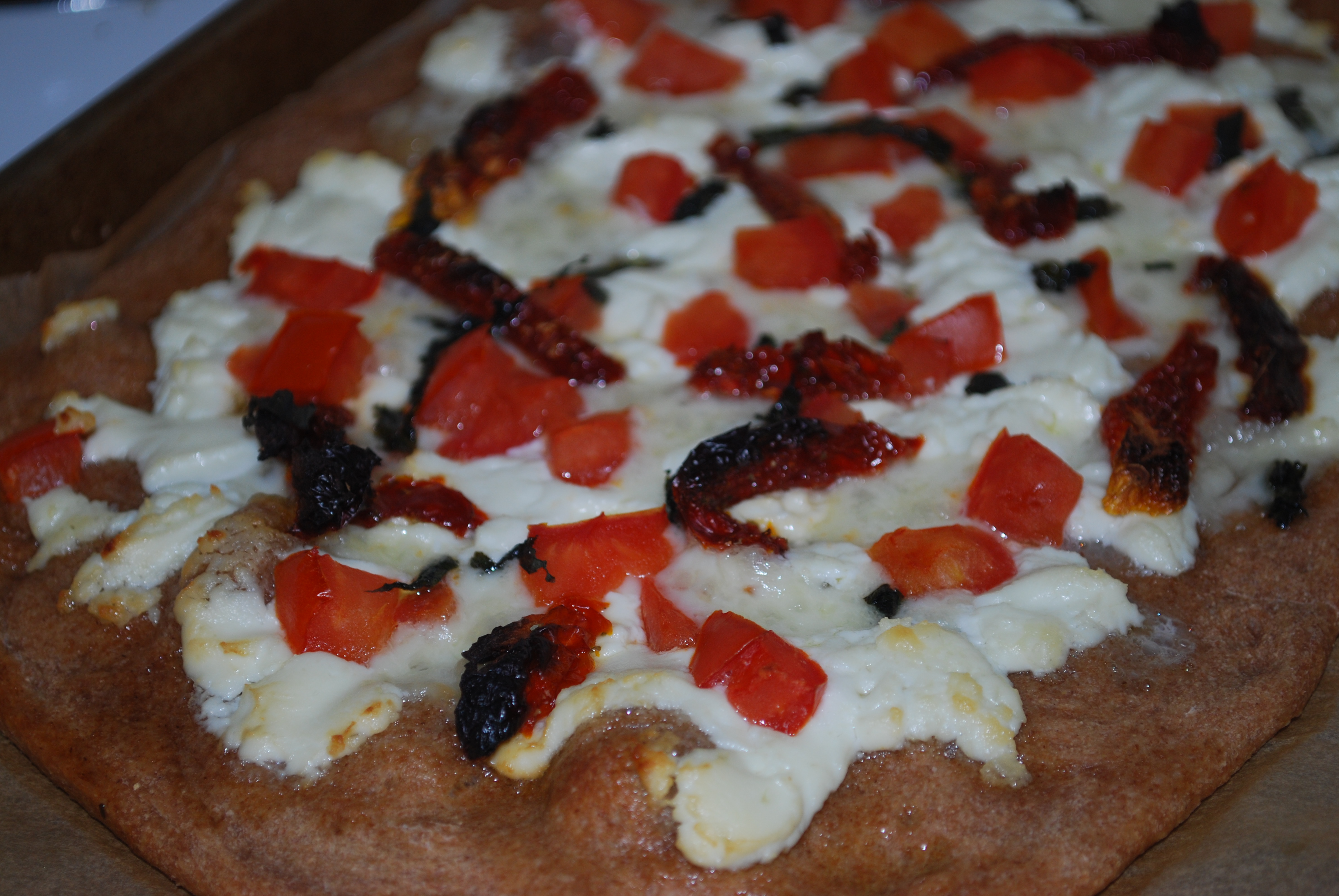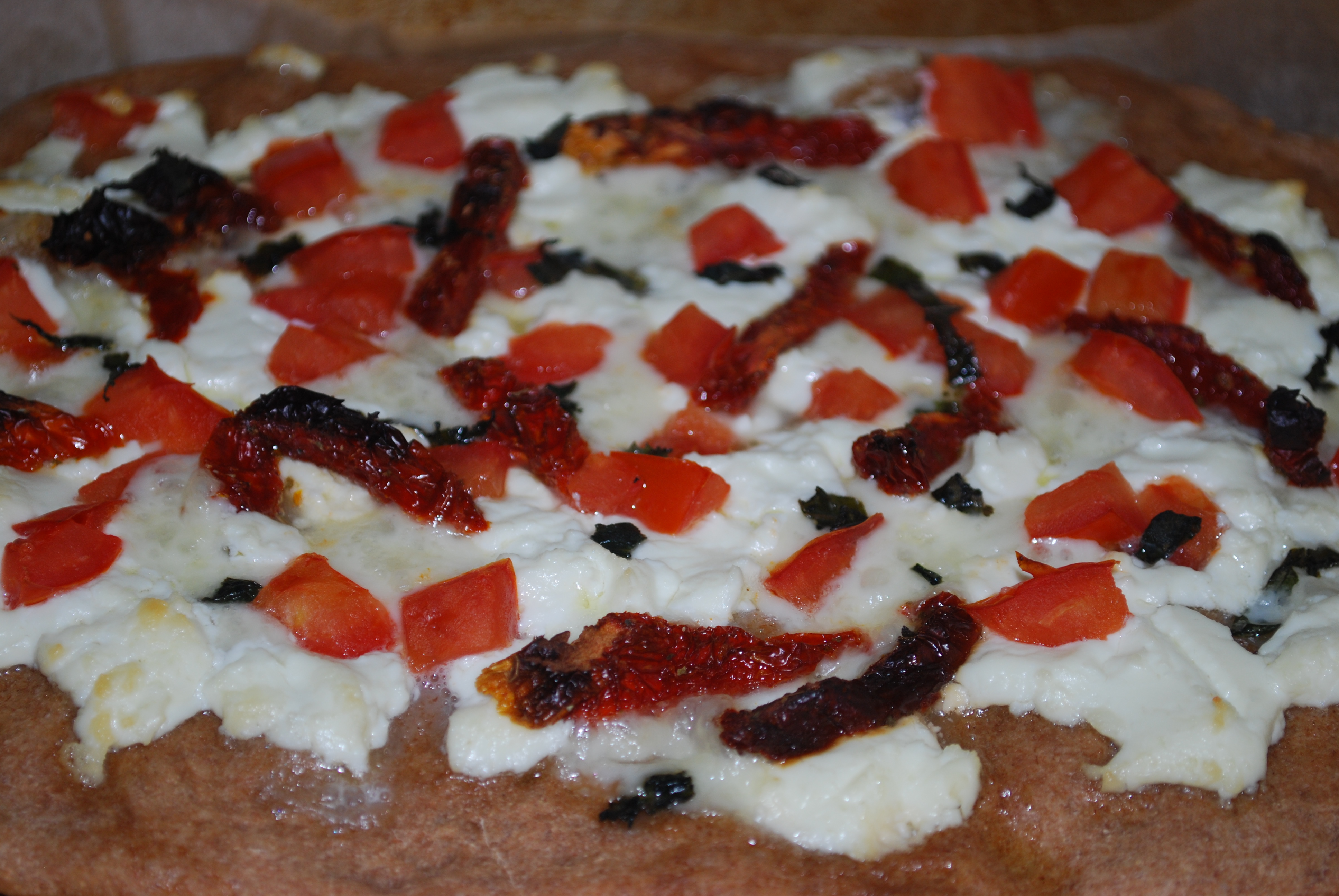 So here is my version of one of my favorite pizzas: Chevre and Sun-dried Tomato Margarita Pizza.