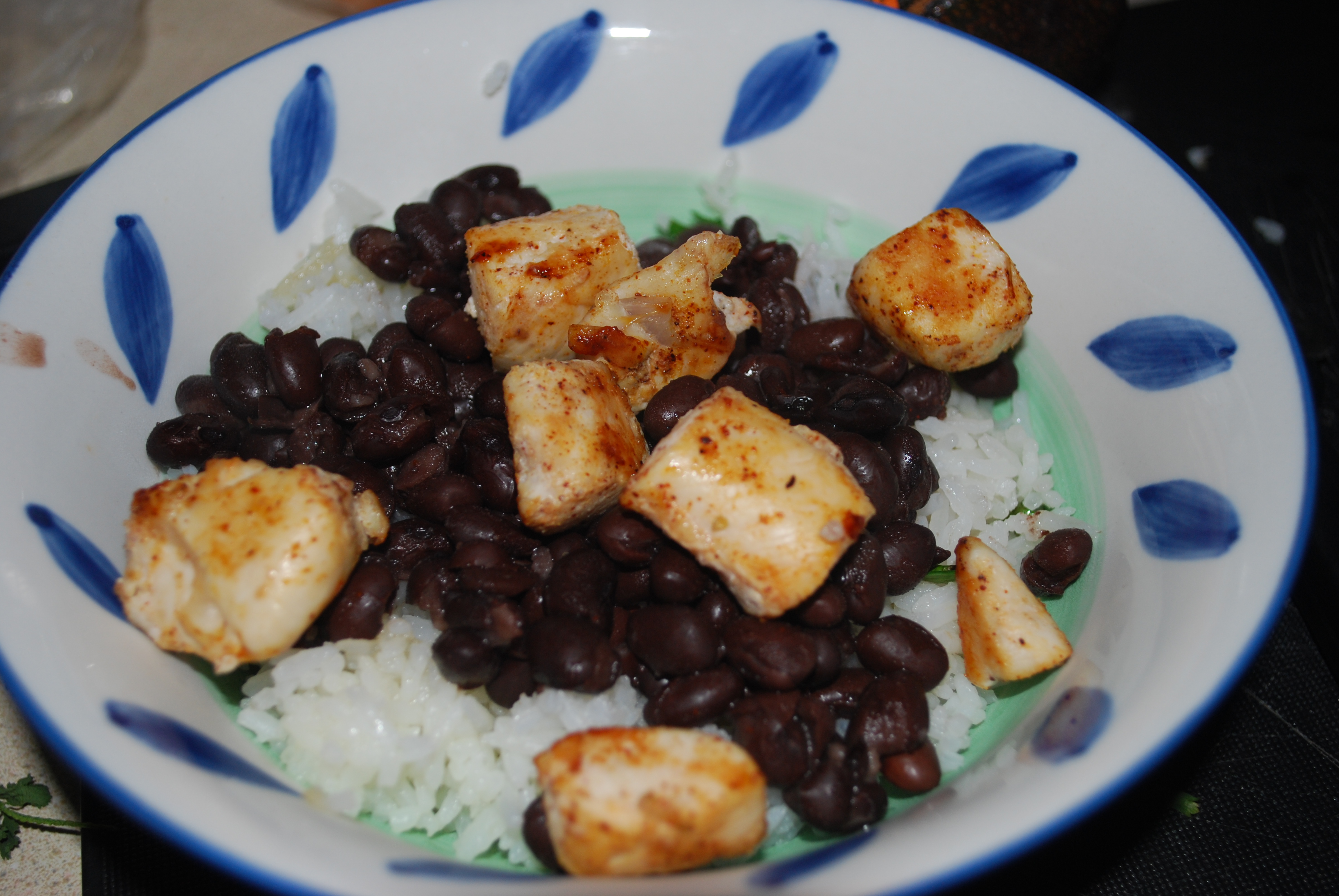 Meanwhile, while both the rice and chicken are finishing up, prepare the beans. Take 1 can of black beans and drain and rinse them. Heat beans in a sauce pan on low heat with a little bit of water and season with oregano, cayenne pepper, chili powder, and cumin.