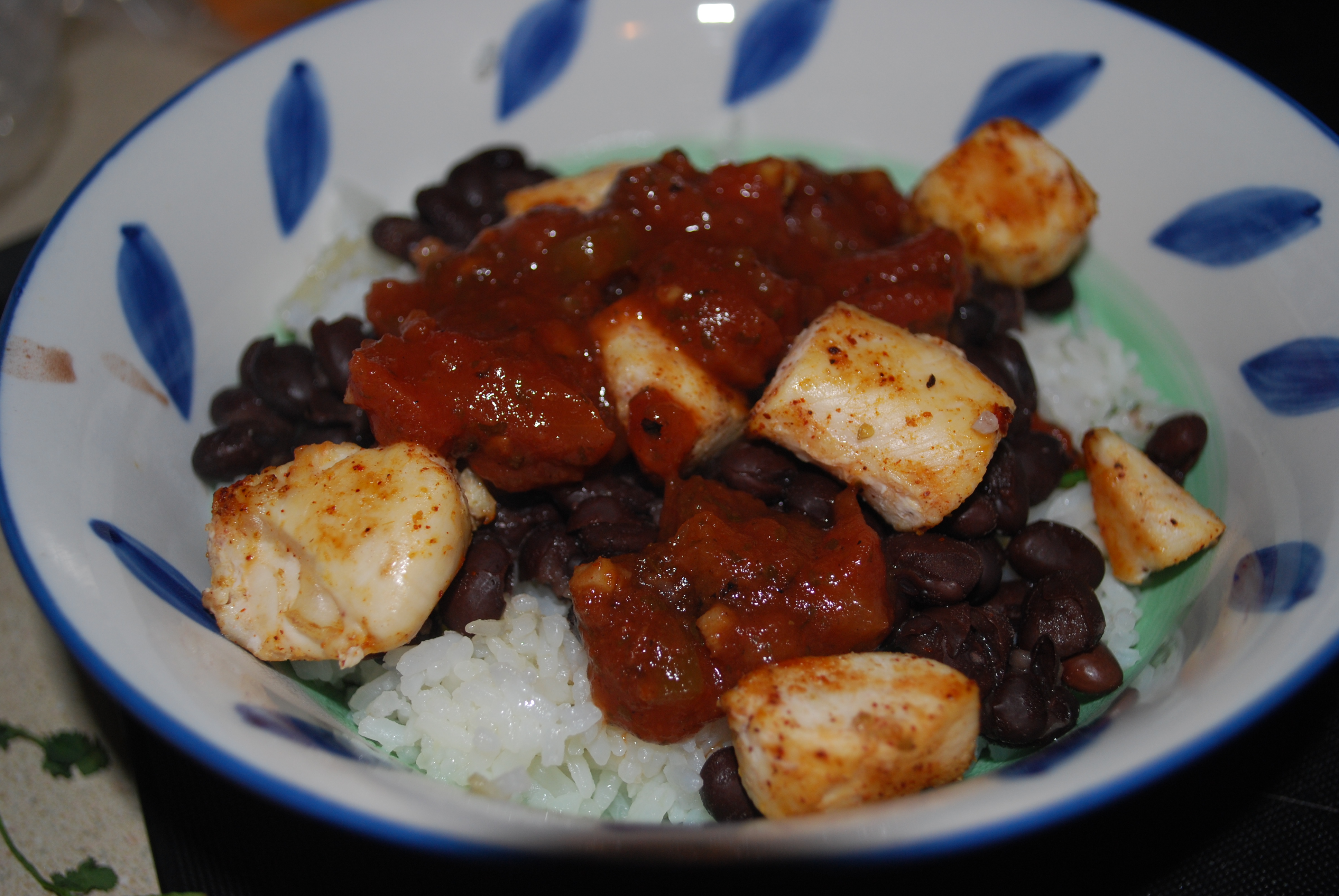 While the rice is cooking, you can start on the chicken. Thaw 2 chicken breasts and cut into 1 inch pieces. Season with cumin, oregano, chili powder, onion powder, garlic powder, cayenne pepper, and salt. Saute in a buttered/non-stick sprayed skillet at medium high heat until cooked through.