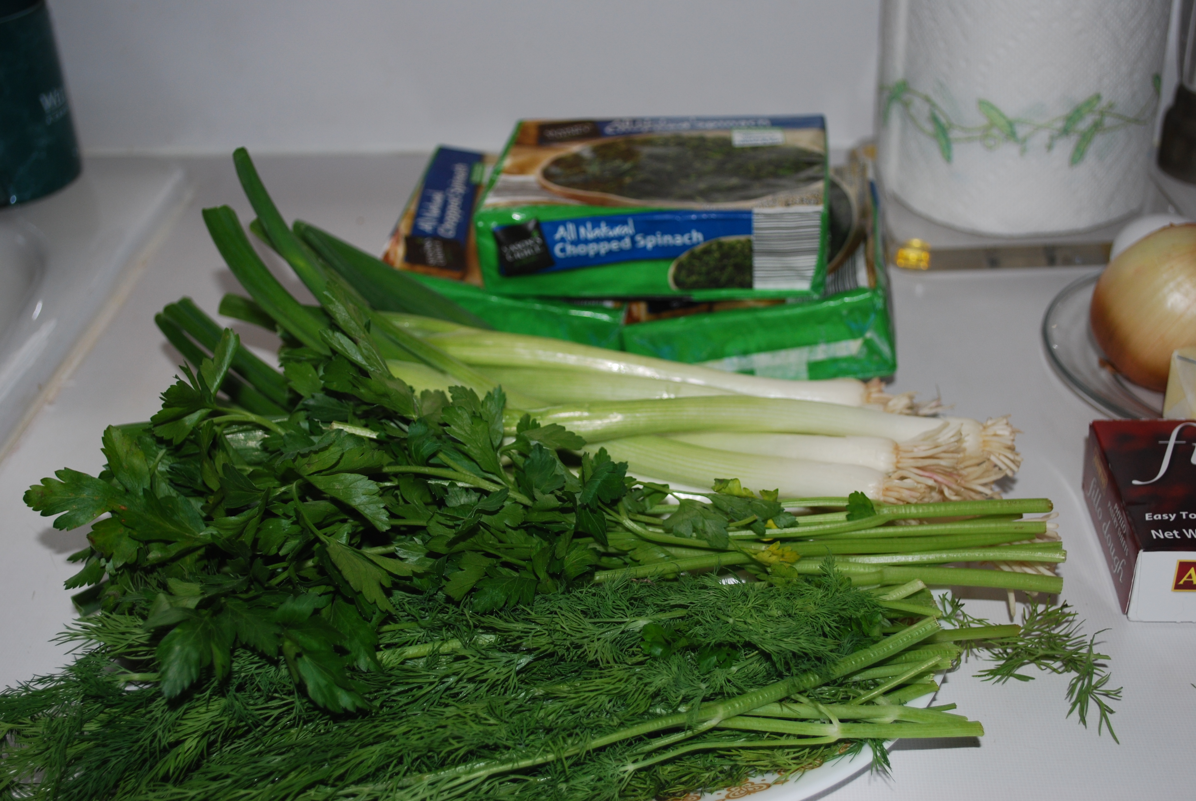 Now you can start chopping. You will need to finely chop 1 yellow onion, 1 bunch (about 2 cups) green onions, 1/2 cup parsley, and 1 cup dill. You should also crumble 1/2 pound Feta cheese to have it ready.