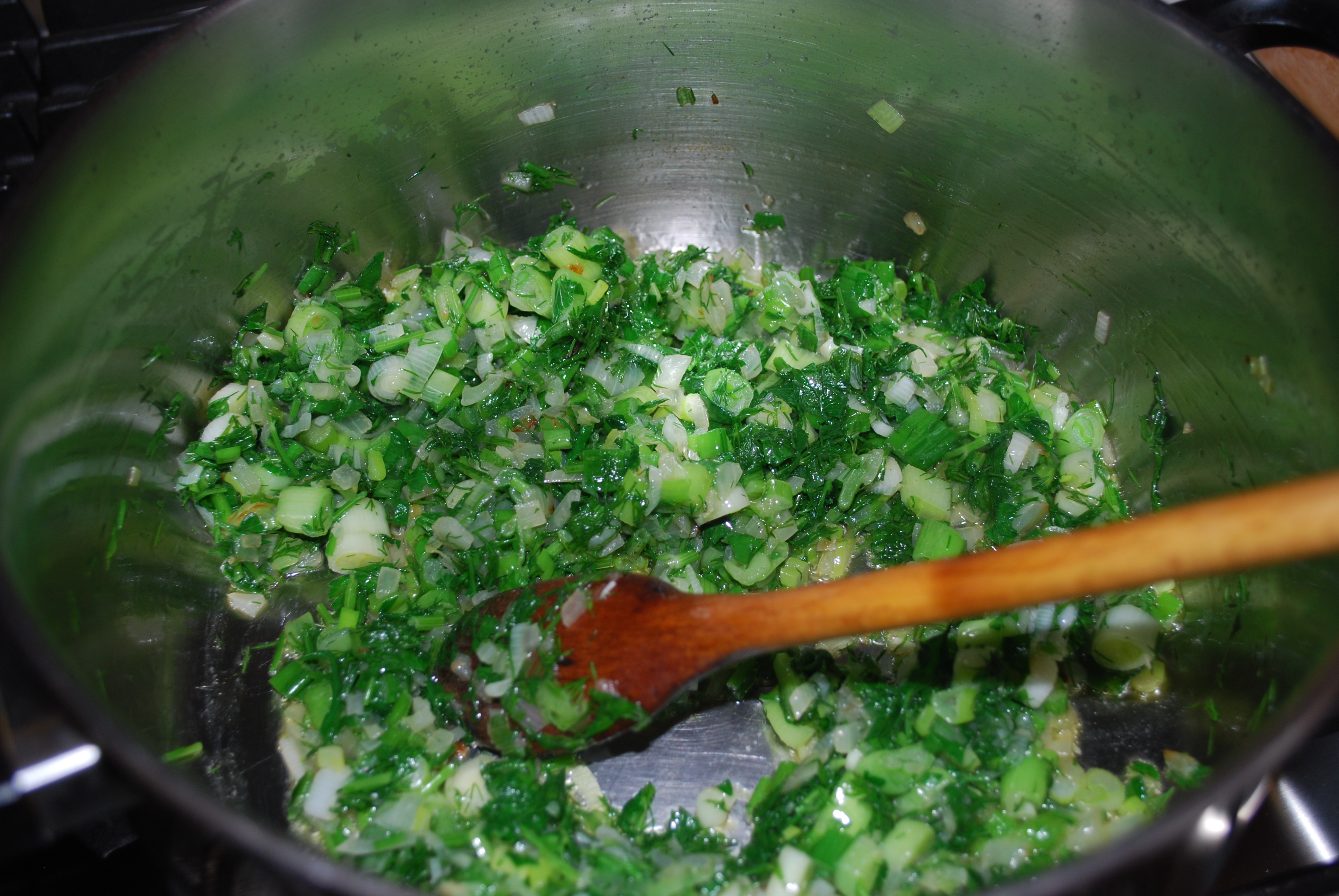 - In sauce pan, saute chopped yellow onion in olive oil on medium-high heat until golden, about 5 minutes. Add in the green onion, parsley, and dill and saute about 5 minutes.
