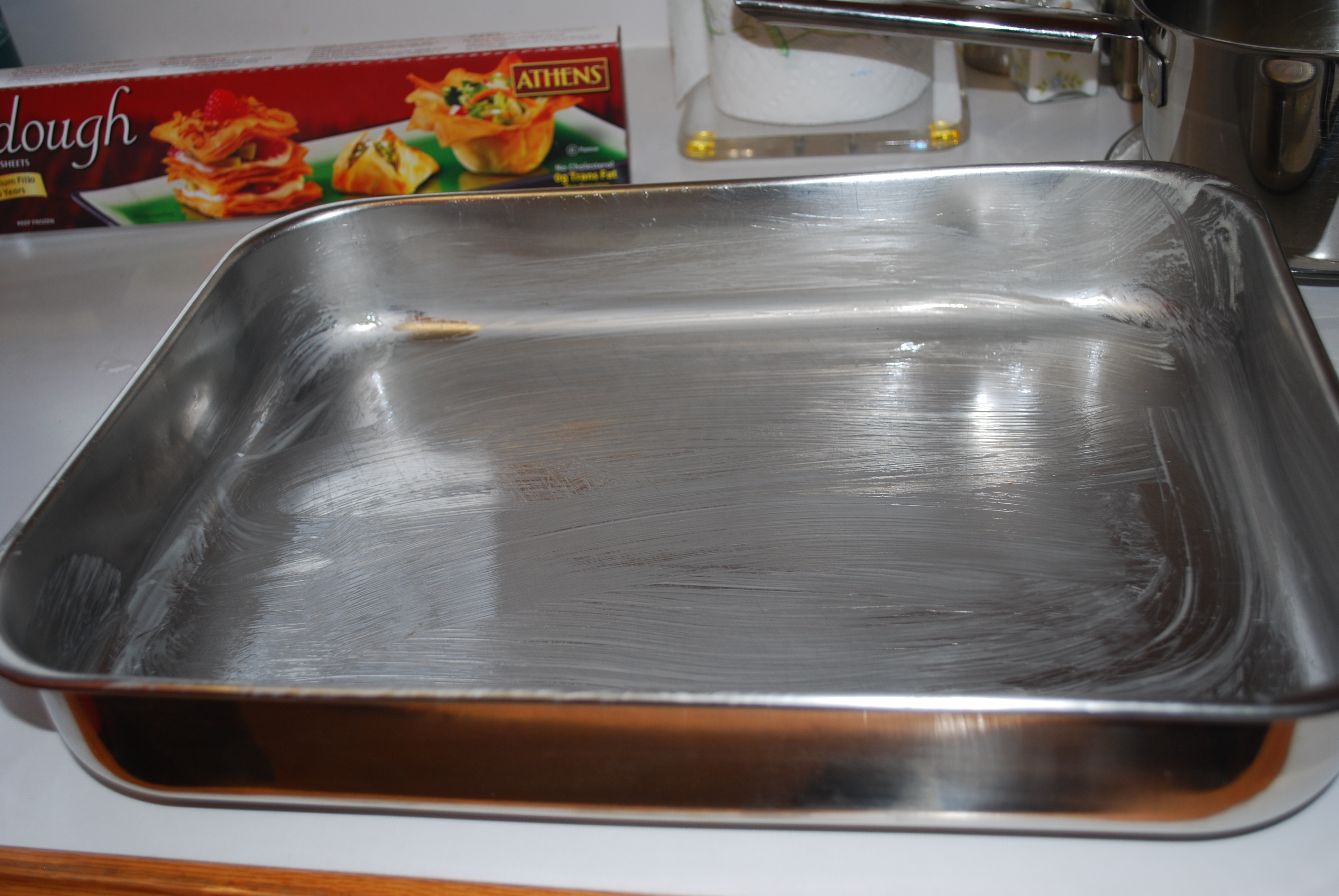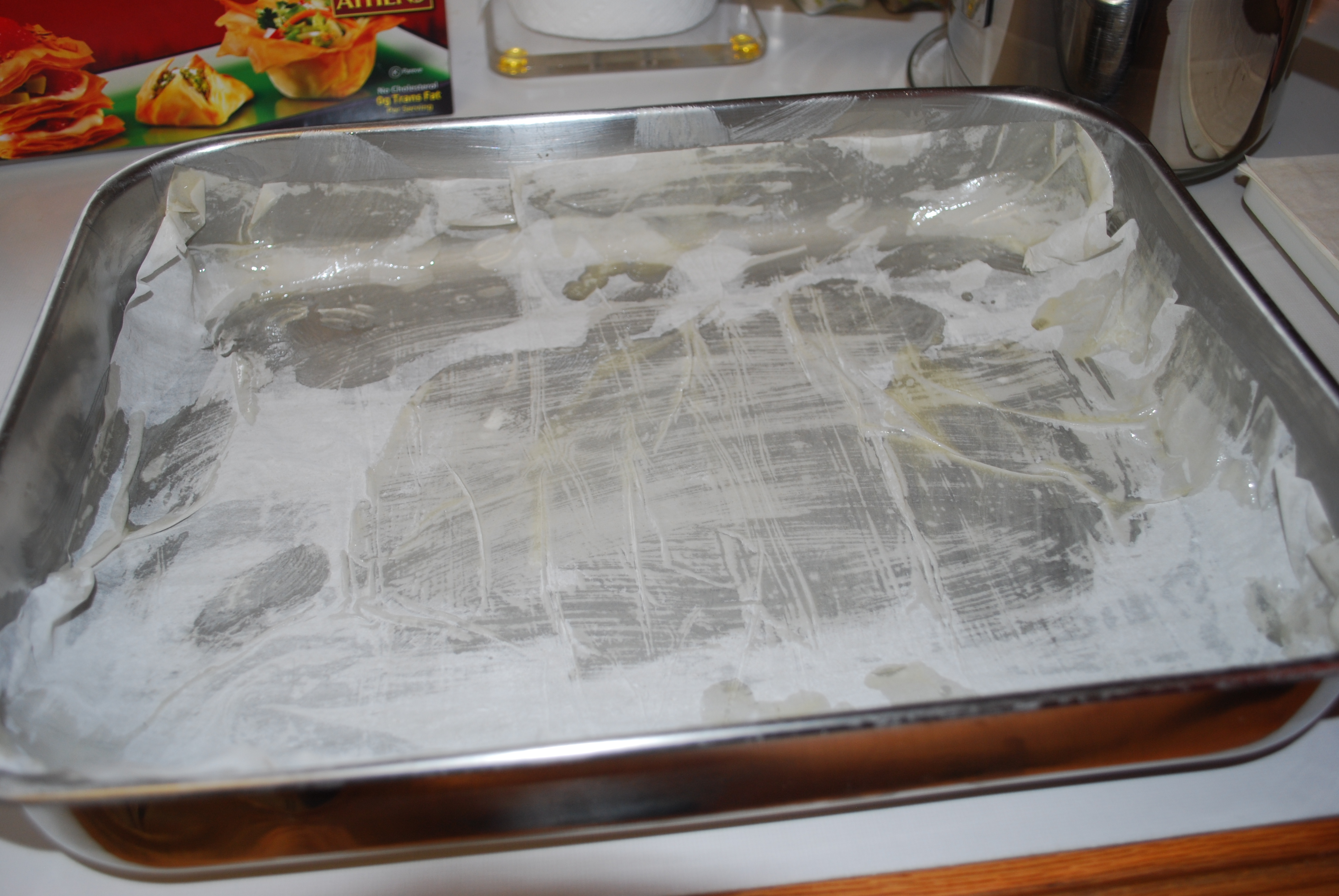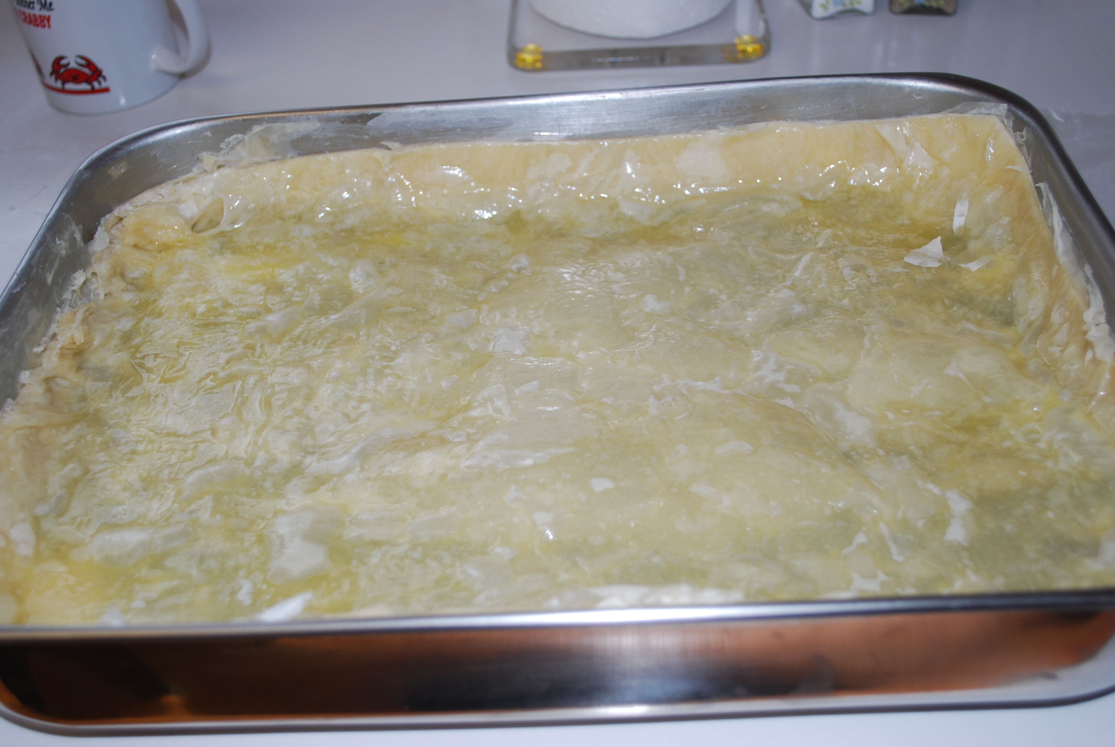 - Melt butter in a sauce pan. Brush a 13x9x2 baking pan with melted butter. Divide your fillo dough in half. Prepare one half on a clean surface to use immediately, then cover the rest with a damp towel so the sheets don’t dry out. Place one fillo sheet on the baking pan, then brush with butter. Repeat with the 1/2 box of fillo sheets you have prepared.