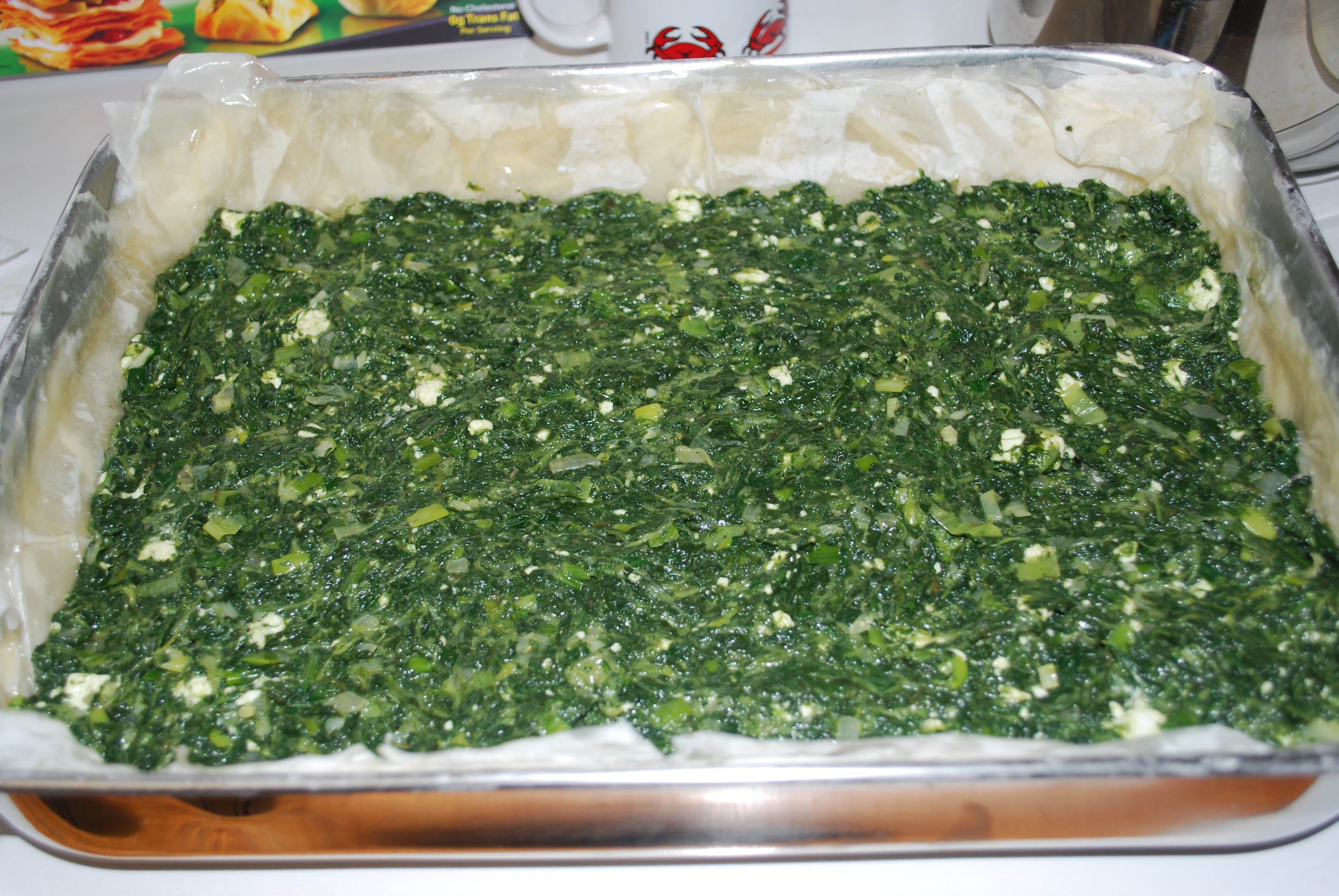 - Pour the spinach mixture on top of the fillo sheets in the baking pan, then spread evenly. Get the rest of the fillo sheets ready (1/2 the box) and place one fillo sheet on top of the spinach mixture then brush with melted butter. Repeat until you have used every fillo sheet. Pour the remaining butter on top.