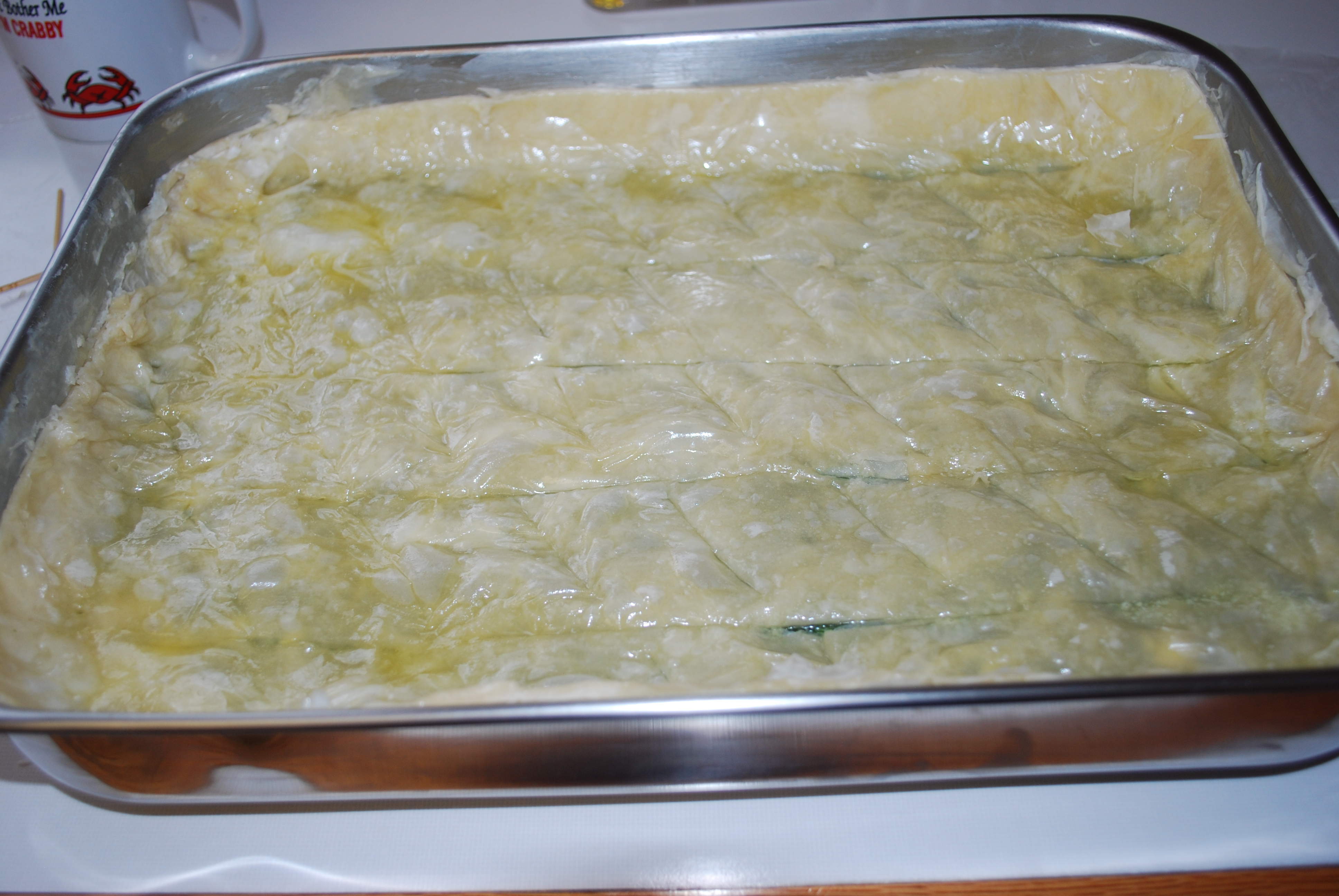 Cut through only the top layer of fillo so that you can make neat cuts later on, after the Spanakopita has cooked. Cut horizontally across the pan, then cut diagonally across the horizontal cuts to make diamonds.
