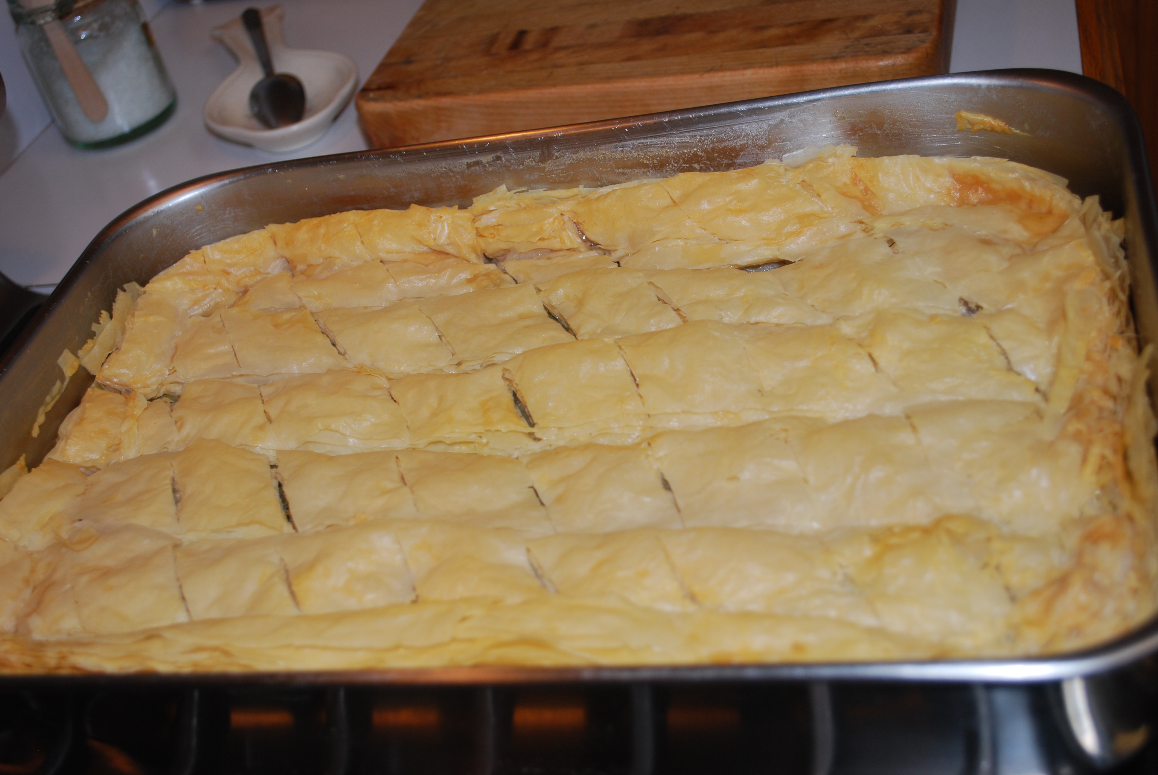 Place Spanakopita in the oven and cook at 350 for around 45 minutes, or until the pastry is puffy and golden. We ended up having to cook ours about 1 hour, so the time will probably depend on your oven – just make sure you wait to take it out until the pastry is golden.